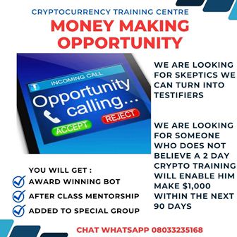 We have verifiable testimonies of past participants (in text, audio, video formats) whom we are constrained to reveal cause of privacy policy. At CTC, we have demystified money making cryptocurrency trading with the use of quality tools to churn in money for you even while you sleep. Waste no more time, delay gratification, inconvenience yourself if need be, make that informed decision to acquire generational skills that will pay you 💲for the rest of your life. If you are really serious to make money $ in cryptocurrency trading CANCEL or POSTPONE every pre-planned appointments even your own ceremony to attend this training even if you are outside Lagos state. JOIN US TODAY
